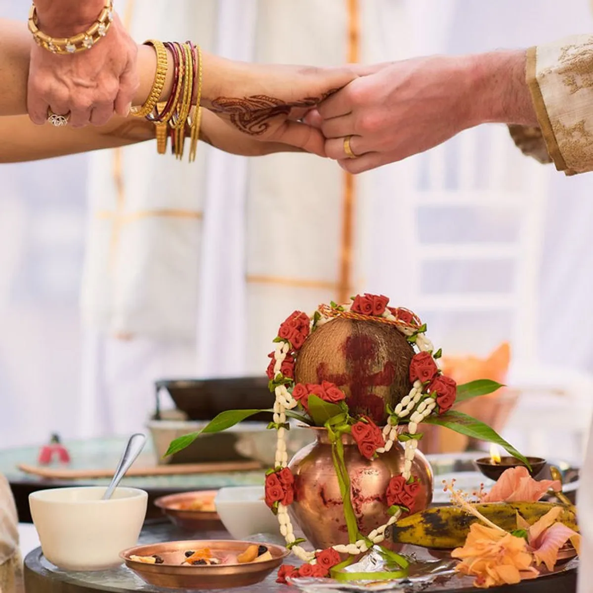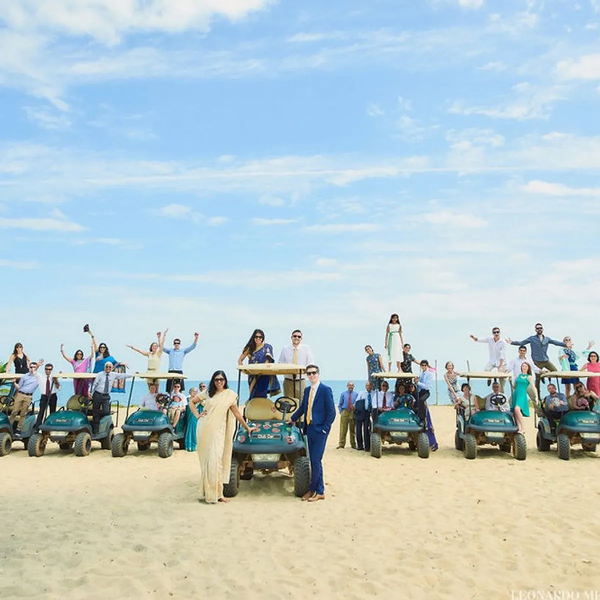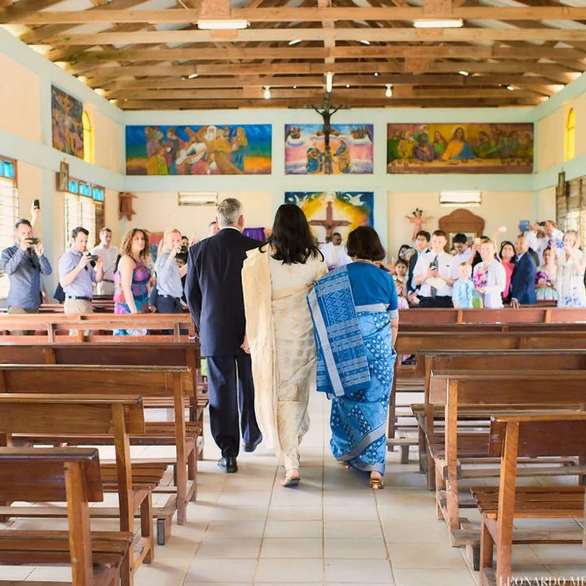 The day of the wedding, the sun was shining, and guests started getting ready for an early ceremony at the local catholic church. A golf-cart procession was lead by the groom down the dirt road to the church, which had the most scenic views of the Caribbean Sea. After the ceremony, the couple headed back to the Villas for some R&R, and changing of clothing for the Indian ceremony. While the group was getting ready, family members prepared the space, and helped us ensure everything was set-up properly. We loved learning about the traditions of the region, and learning about their culture. With narration by family members, guests were guided through the ceremony.