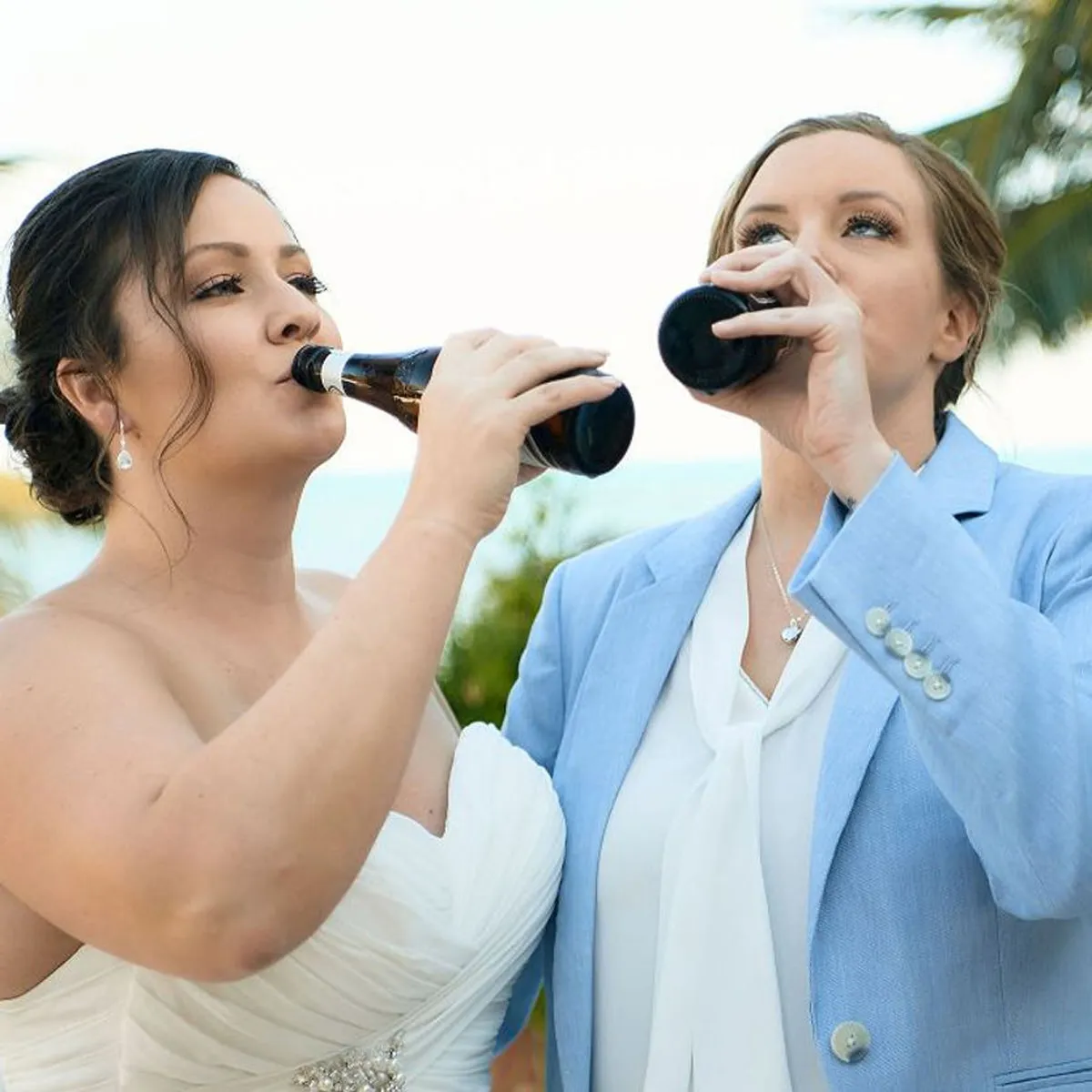 Each bride showcased her unique style—Erica shimmered in a flowing strapless gown adorned with sparkling details, while Elizabeth looked sharp in a sky blue blazer paired with white pants and a loose tie. As they exchanged vows, the shimmering blue water served as a breathtaking backdrop, moving their guests to tears.