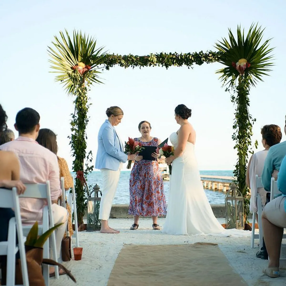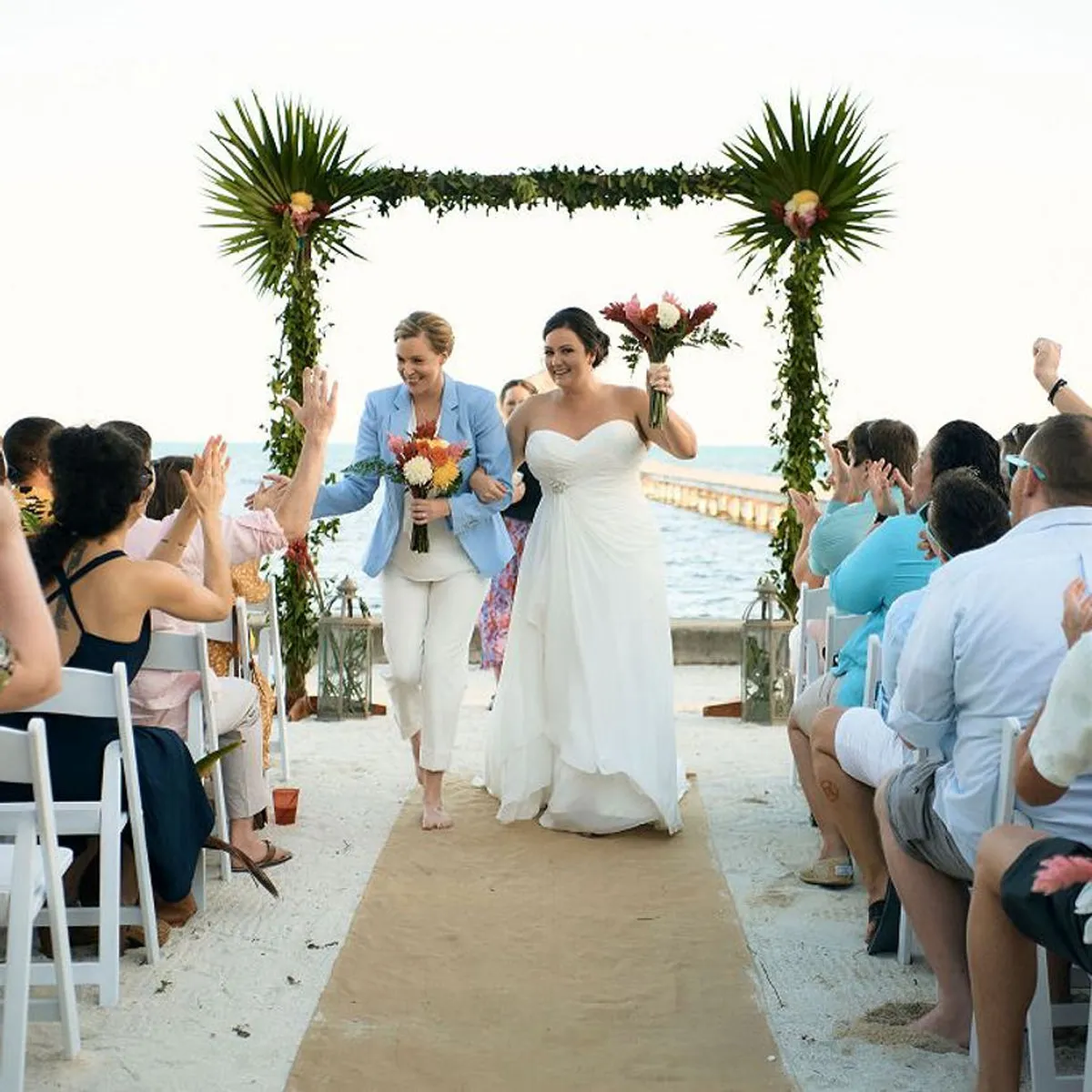 After the ceremony, the newlyweds took a serene walk along the pier, the setting sun casting lovely silhouettes against the calm waters. Congratulations to the radiant brides on their beautiful day!