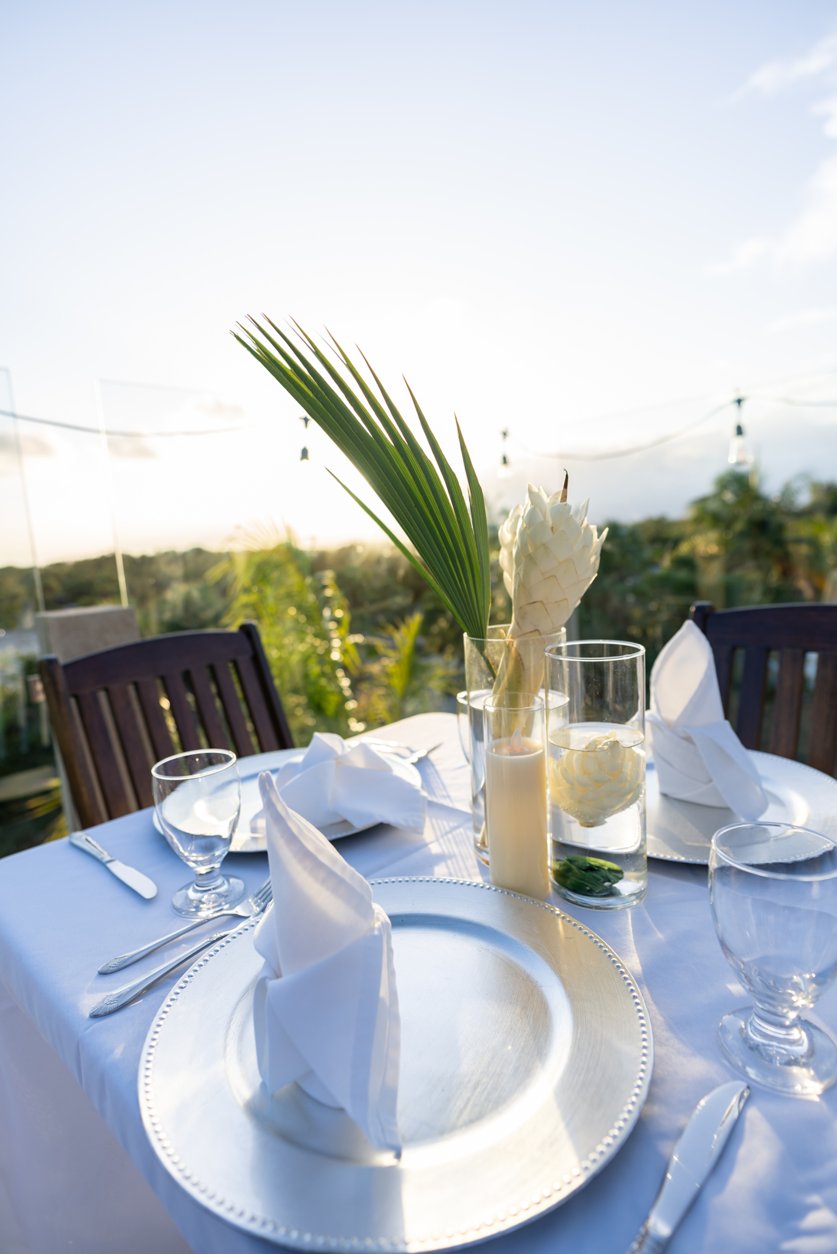 A cozy 550-square-foot covered space ideal for intimate gatherings right on the sand, offering shade, refreshing sea breezes, and beautiful ocean views, creating a relaxed yet romantic setting perfect for heartfelt ceremonies, private dinners, or sunset celebrations by the water.