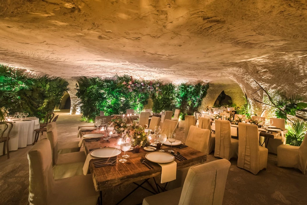 Tucked within Hotel Xcaret México, the stone cave galleries offer a one-of-a-kind intimate setting, where views of emerald water inlets and secluded islands create a truly romantic atmosphere for your celebration.